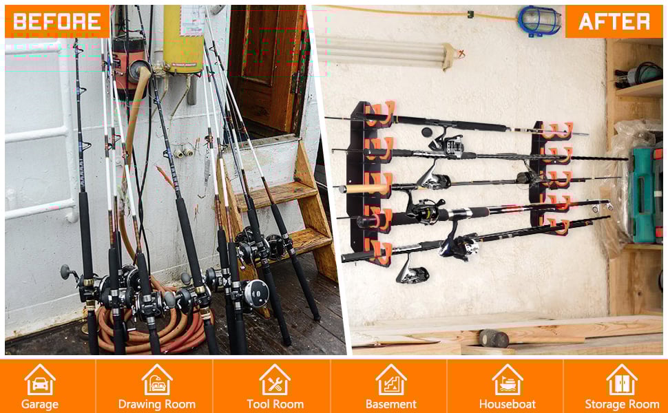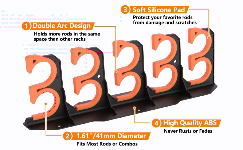 ăInnovative Arc Structure DesignăThis fishing rod holder storage adopts an innovative Inclined Opening combined with Arc Structure Designed. The Inclined Opening makes easily store or take out your fishing rod simply insert the butt of the rod into one of the holes and guide the tip through the opening on the opposite rack for safe storage.Please alternate the direction the rod is facing on the top and bottom hooks to make sure it holdsa total of 10 rods with reels without hitting each other.The arc structure ensures rods and combos wrapped well and securely in your fishing rod rack.